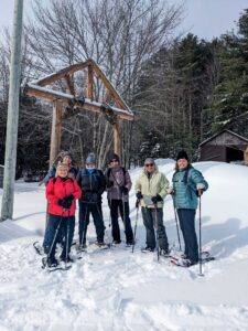 It was the our first visit to Ski De Fond Estérel since 2014. With all the recent snowfalls and the nice temperatures, we all enjoyed the beautiful ski and snowshoe trails. It’s a small ski center compared to others we visit but still a very enjoyable center to add to our repetoire. Five happy snowshoers marvelled at all the evergreens coated with snow on the winding forest trail (Erabliere) at l’Estérel, which wins the prize for prettiest trail this season. Thanks to Debbie for tipping us off to this lovely park, complete with cute warming huts and bird feeders. And thanks to all our photographers (Ann, Erwin, Maureen, Tom V & Dennis ) for taking lots of scenic shots along the way. (Notes by Dennis and Karen)