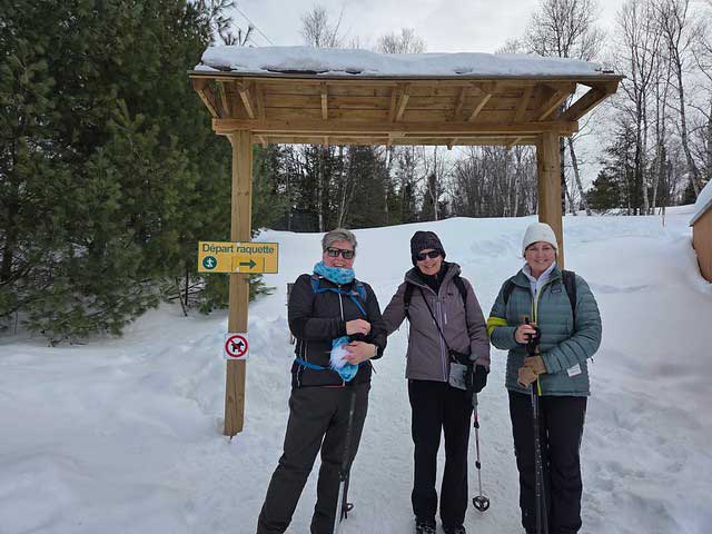 It was the our first visit to Ski De Fond Estérel since 2014. With all the recent snowfalls and the nice temperatures, we all enjoyed the beautiful ski and snowshoe trails. It’s a small ski center compared to others we visit but still a very enjoyable center to add to our repetoire. Five happy snowshoers marvelled at all the evergreens coated with snow on the winding forest trail (Erabliere) at l’Estérel, which wins the prize for prettiest trail this season. Thanks to Debbie for tipping us off to this lovely park, complete with cute warming huts and bird feeders. And thanks to all our photographers (Ann, Erwin, Maureen, Tom V & Dennis ) for taking lots of scenic shots along the way. (Notes by Dennis and Karen)
